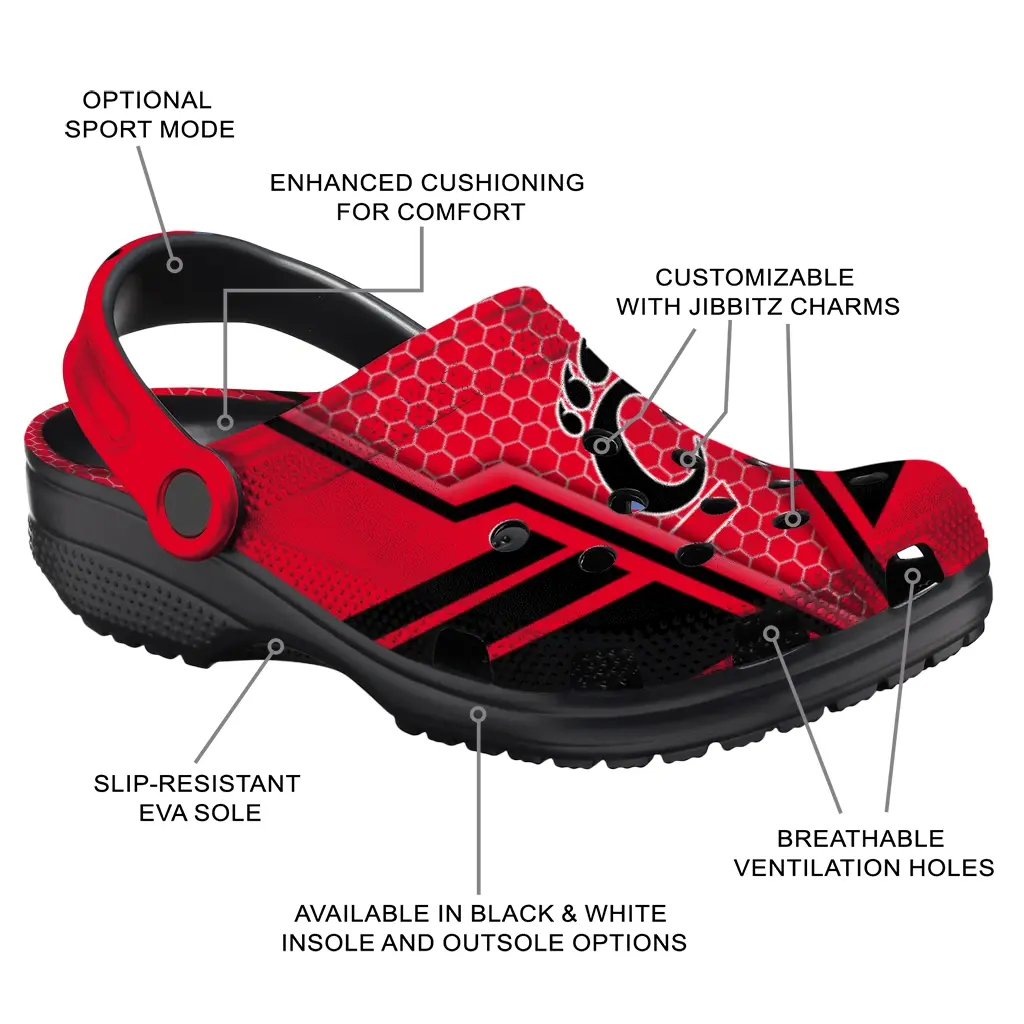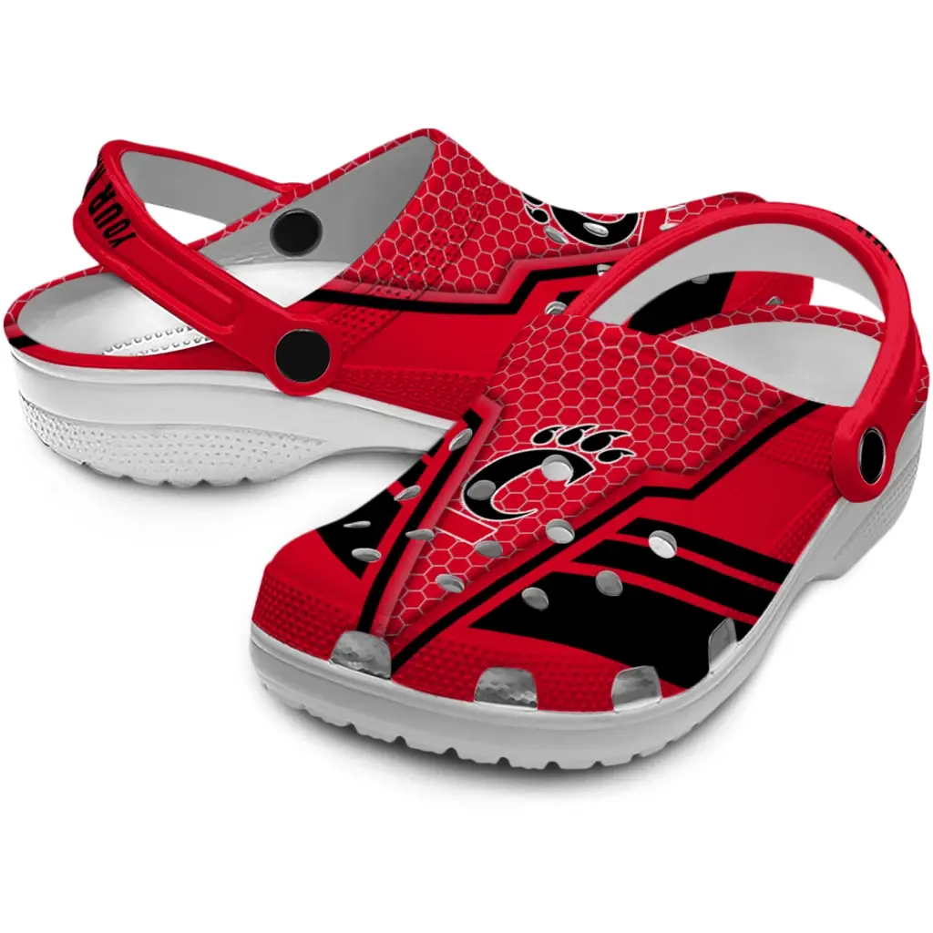 Step into comfort and style with the Cincinnati Bearcats Clog – Personalized Hexagon Shield Red, designed for all-day wear whether you’re tailgating, heading to a vacation, or just kicking back on game day. These clogs offer a sporty yet laid-back vibe that blends perfectly with your lifestyle, giving you versatile footwear for a range of casual occasions.