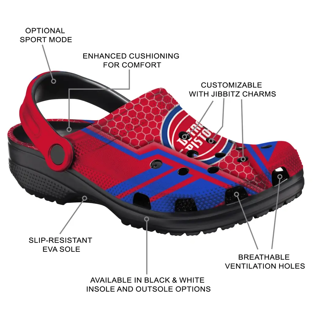 Step into easygoing style with the Detroit Pistons Clogs – Customized Hexagon Shield Red. These clogs are designed for laid-back days, whether you’re heading to game day, tailgates, vacations, or just kicking back around town. Crafted for both men and women, they blend casual comfort with a versatile look that fits effortlessly into your lifestyle.