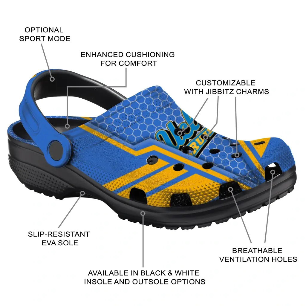Step into casual comfort with the UCLA Bruins Clog – Personalized Hexagon Shield Blue, designed for those who want versatile footwear that fits seamlessly into game day, tailgates, vacations, and everyday activities. Crafted from lightweight materials, these clogs deliver relaxed support and easy wearability whether you’re cheering on your team or just out and about.